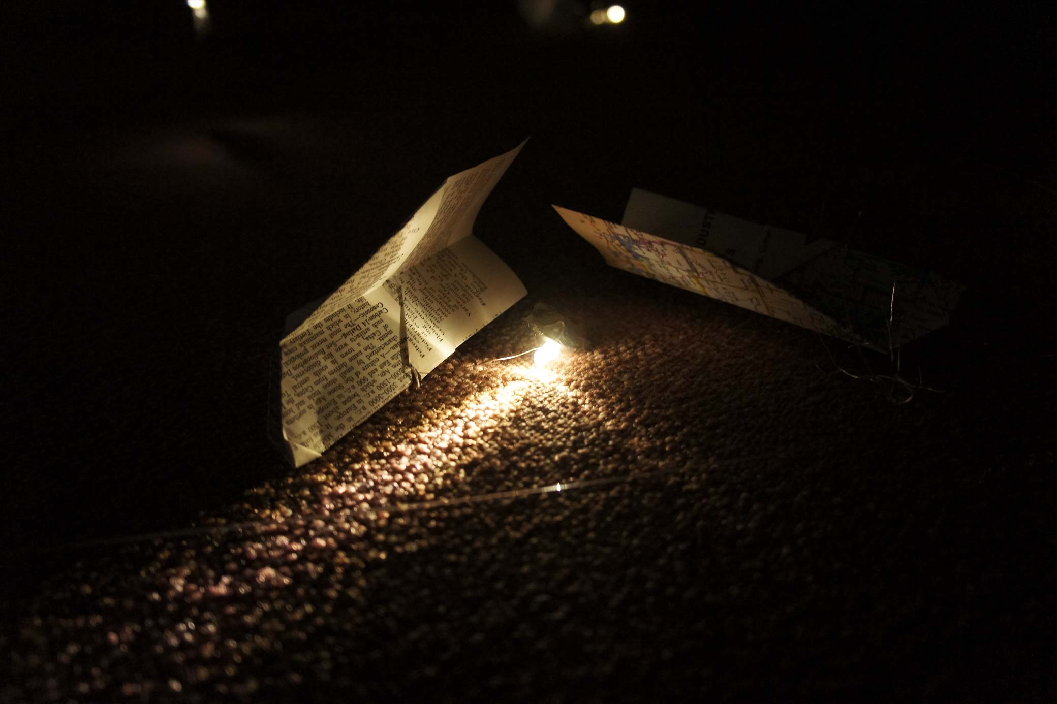 結構な罪悪感を覚えながら,一ページ一ページを切り取って紙飛行機を折った.すると本に綴じられていたデータは紙の翼を手に入れて空を舞うようになった.まるで,電信の仲間入りをしたみたいだ.物理的な空飛ぶデータは遠くに浮かぶ.それを見つけるために電線を垂らしてLEDをつけた,そして光をあてた,辞典を引くことは言葉に光を当てていくことに似ている.LEDに照らされた紙飛行機は光った,実物よりも何倍も大きい影を天井に映し出した.続けて,何個も何個も宙に浮かべた.図書館の天井に張り巡らされたテグス,飛行機と飛行機は互いに細い透明な線で連結されている.実体はあるけど空気のように軽いデータ.人の移動や空調で起こるわずかな風を受けて揺れた,そして透明な糸でリンクした飛行機同士はその揺れを増幅し次々に揺れた.その度に接触不良のLEDは点滅したり,振り子のように揺れて,飛行機の光と影に動きを与えた.影で出来た大きな空が図書館の天井に広がっていた,風が起こるたび,光と影の様態を変え続けている.静的な時間と動的な時間,たくさんの光の点が作る星々,影と風が作る動き,光に照らされた紙飛行機が揺れた.気づくとみんな寝そべってそれを見ていた.